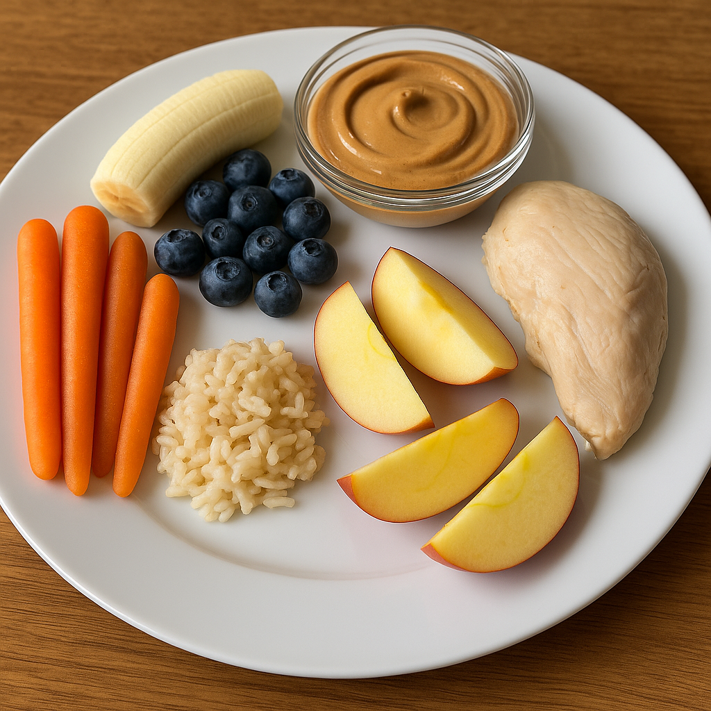 Carrots, apples (no seeds), blueberries, bananas, plain cooked meats, plain rice/oatmeal, xylitol‑free peanut butter.
